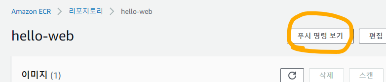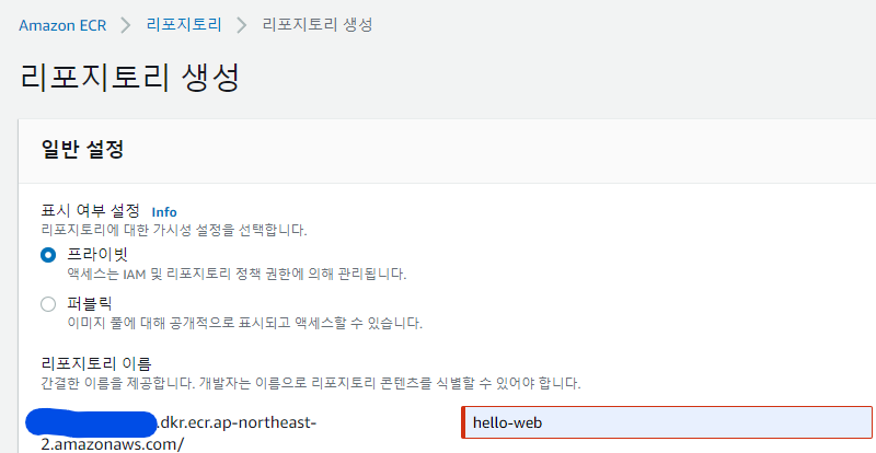 AWS Console에서 ECR로 가서 저장소를 추가합니다. 여기서는 hello-web이라는 이름으로 명명하겠습니다.