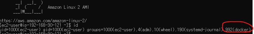 설정 후 재접속해서 id 명령으로 ec2-user 계정에 docker 그룹이 할당된 것을 확인합니다.