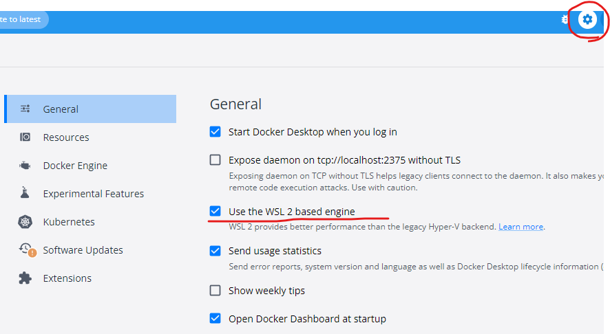 Docker Desktop -> Settings 에서 "Use the WSL 2 based engine" 옵션을 활성화
