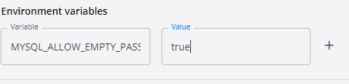 mysql 이미지를 실행할 때 내부 테스트를 할 경우에는 비번을 굳이 설정하지 않을 경우가 있습니다. 실행 옵션-> "Environment variables"에 MYSQL_ALLOW_EMPTY_PASSWORD을 아래 이미지처럼 등록합니다.