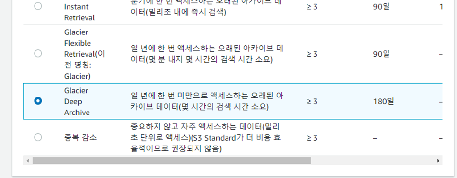S3 Standard의 경우 0.023USD/GB이며 가장 저렴한 S3 Glacier Deep Archive는 0.00099USD/GB입니다. 무려 Standard 비용 대비 96%를 절약할 수 있으므로 장기 백업용 파일은 꼭 Glacier Deep Archive를 이용하세요. (us-east-2 기준, 한국리전은 us-east-2 대비 2배입니다.) 1TB를 백업하신다면 1USD/ month 가 되겠네요.