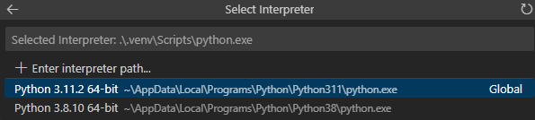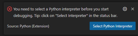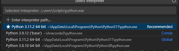 2. 현재 인터프리터가 선택되어 있지 않다면 선택 다이얼로그가 활성화됩니다.