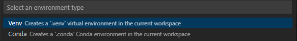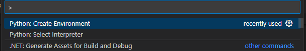 1. 윈도우라면 ctrl+shift+p 를 누르시면 아래와 같은 기능 선택 창이 뜹니다. 여기서 create environment 를 선택하세요.