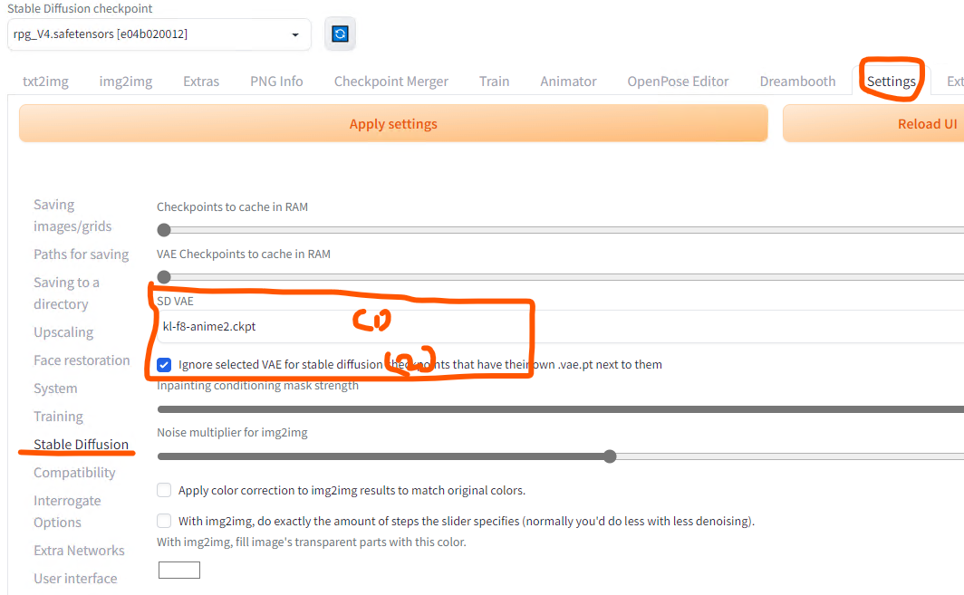 WEB UI에서 VAE를 설정하는 곳은 Settings 탭에 있습니다.