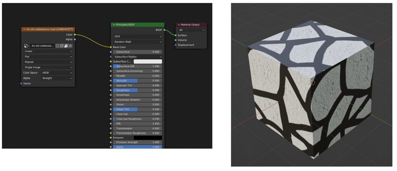 이제 Shader Editor로 이동해서 생성한 텍스쳐를 적용해 봅니다. "Add -> texture -> image texture"를 생성해 방금 생성된 텍스쳐를 지정하고 output의 color를 Base Color에 연결합니다.