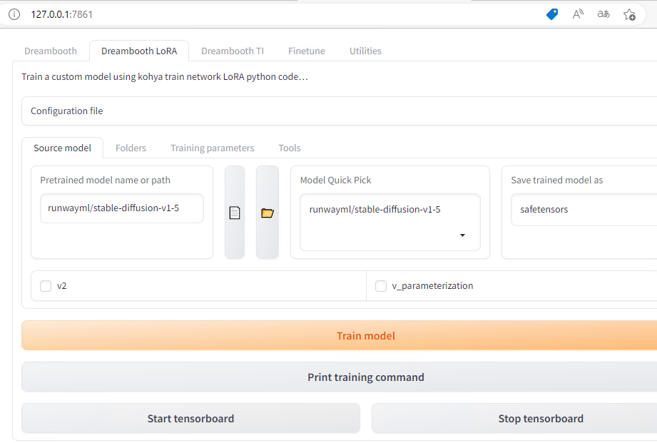이제 다시 "Dreambooth LoRA" 탭으로 돌아와 "Train model"을 눌러 학습을 시도하세요.