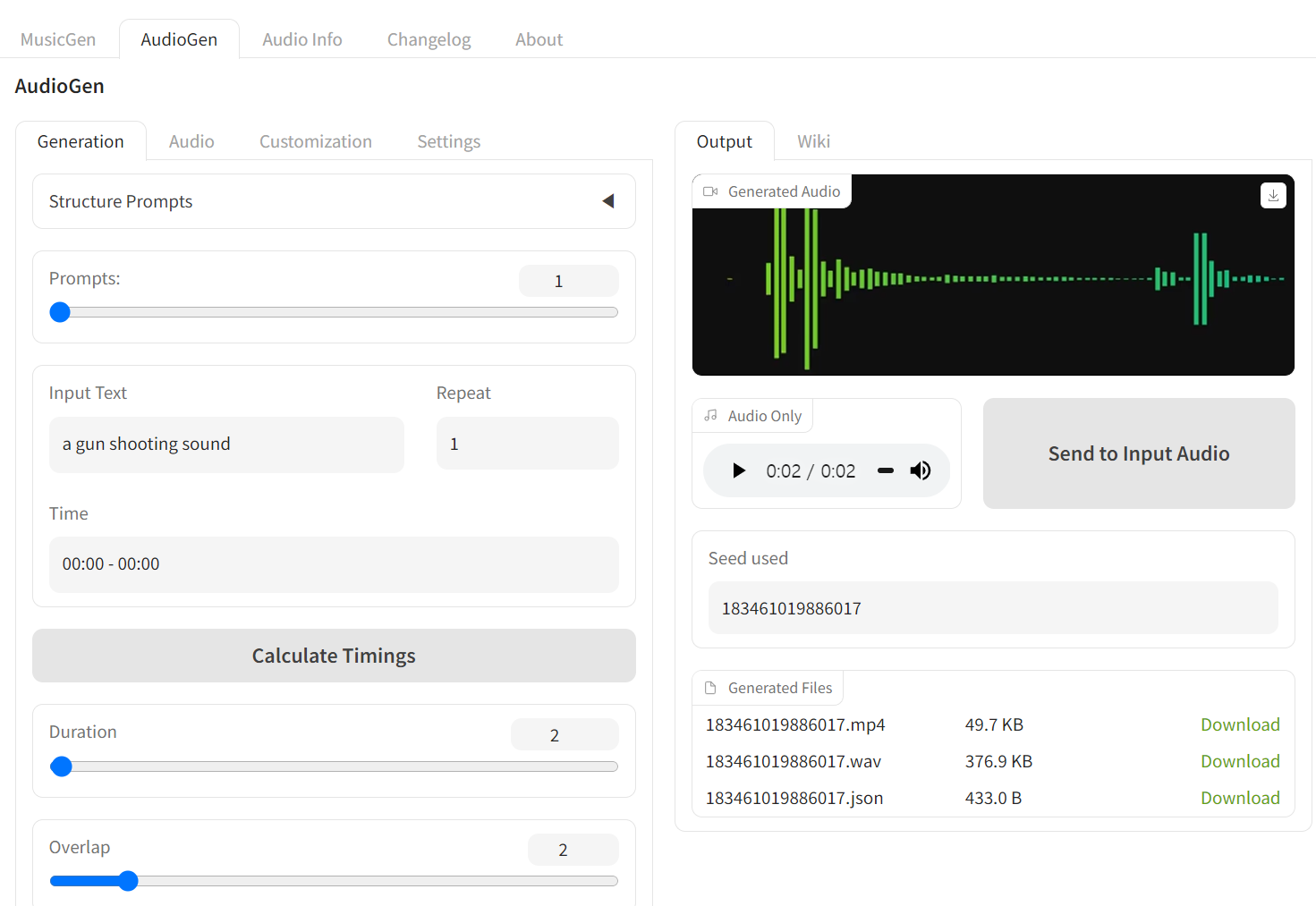 Input Text 에 "a gun shooting sound"를 입력, Duration에 2를 입력 후 생성합니다.