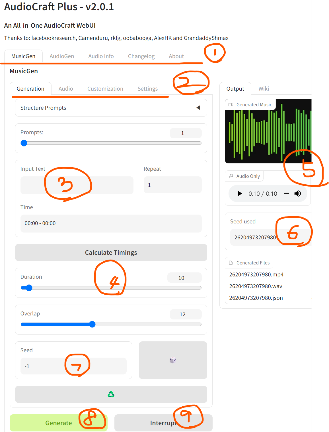 - Duraion과 Overlap은 사운드의 길이를 결정합니다. Duraion은 각 프롬프트의 음악을 길이를 설정하며, (음악을 잘 모르겠지만 원문 그대로 해석하자면...) Overlap을 10s로 지정하면 첫 프롬프트는 30s이며 다음 프롬프트부터는 10s overlap이 있으므로 20s가 됩니다.(프롬프트 세그먼트는 최대 10개까지 가능하며, 한 프롬프트 당 음악의 길이는 최대 30s 입니다.)