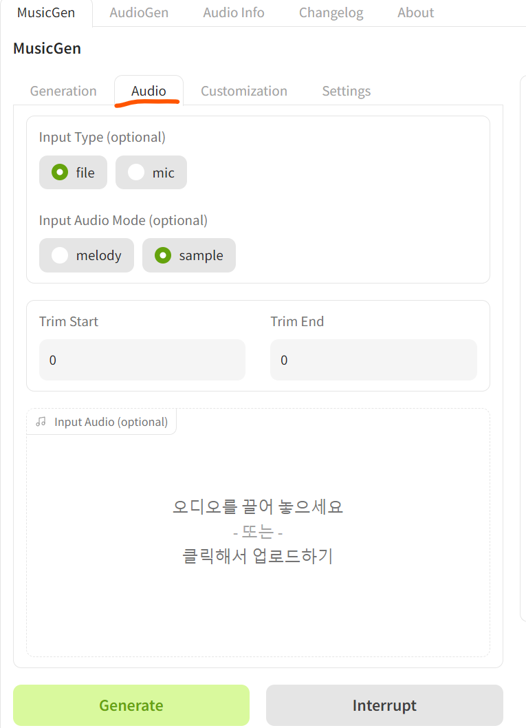 - AudioGen - 이펙트를 생성하는 탭입니다.