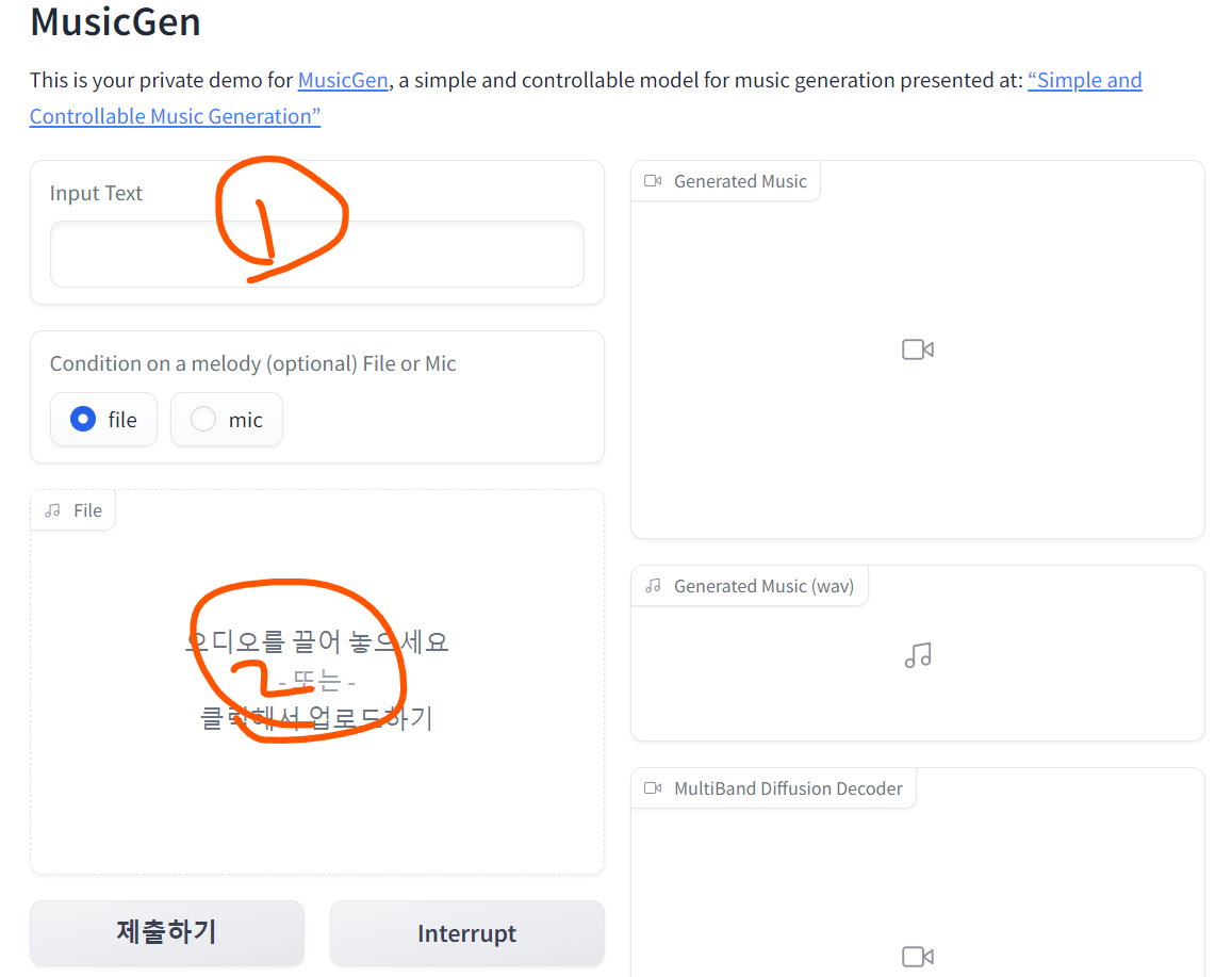 좌측 화면에 보이는 Input Audio에 샘플 사운드 파일을 넣고 생성했더니 입력한 그 파일 그대로 출력되서 의아해했습니다.