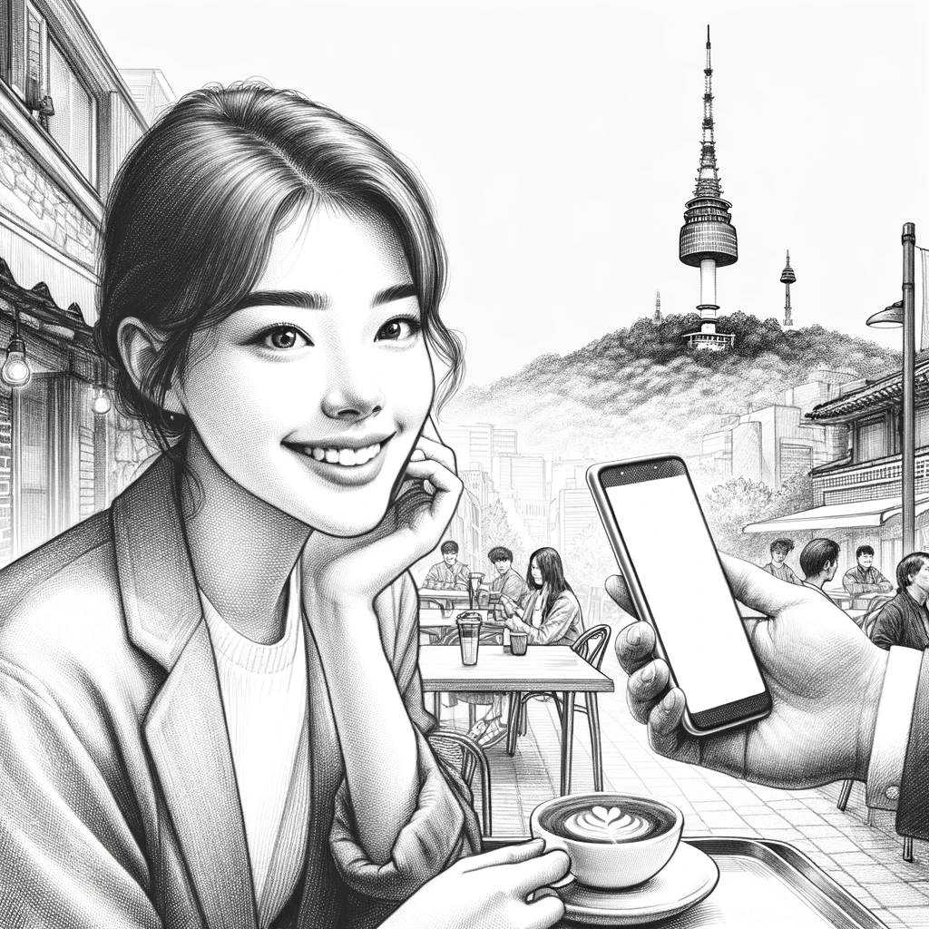 액션: 한 손에 핸드폰을 들고 카페에 앉아있다. 먼 배경에는 남산타워가 보인다. 점원에게 커피를 시키는 듯 한 모습을 취하고 있다.