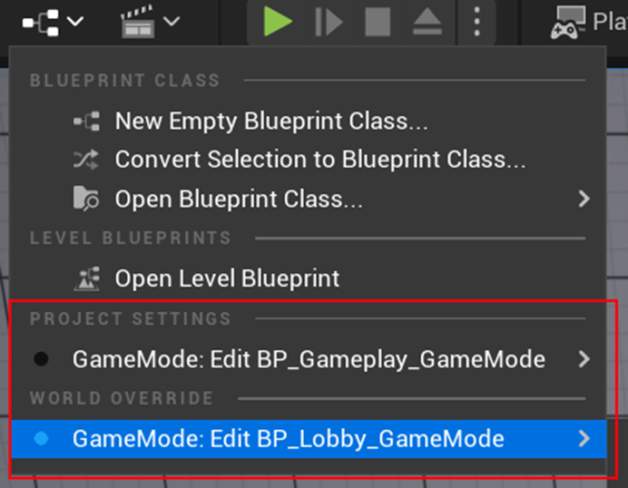 언리얼에는 "GameMode(게임 모드)"라고 명시된 메뉴가 있습니다. (게임 모드와 게임 스테이트 관련 공식문서 링크)