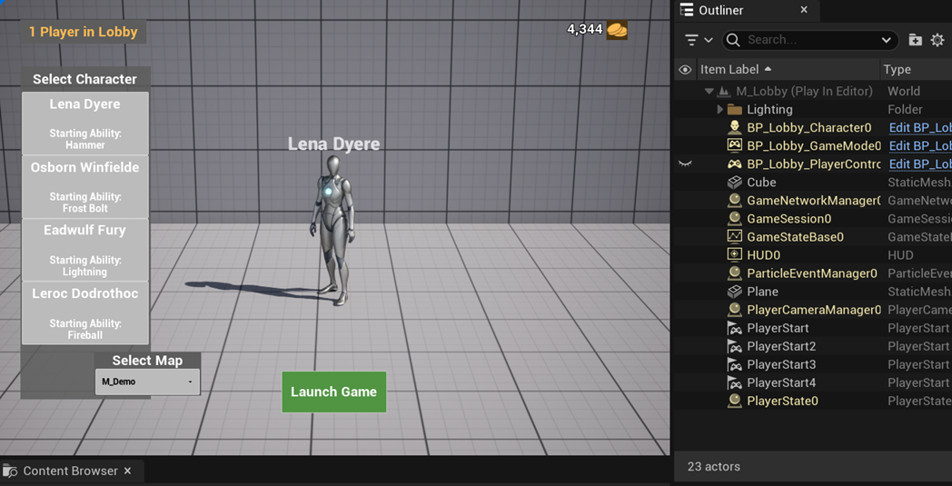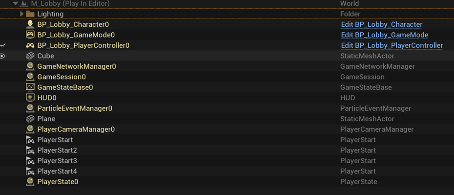이제 게임을 실행하면 BP_Lobby_GameMode에 등록된 BP_Lobby_PlayerController , BP_Lobby_Character들의 인스턴스가 생성되고 각 생성된 인스턴스가 데이터 로딩 및 UI를 생성한다는 사실을 알게 되었습니다.