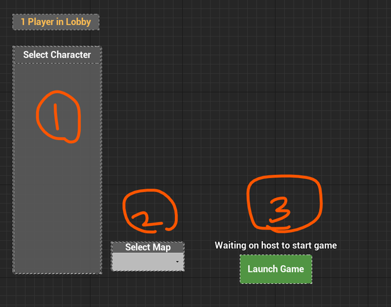 Event Construct 에서는 플레이어 데이터를 확인하여 Gold 표기 및 (1)에 들어갈 캐릭터 리스트를 설정하고 Host일 경우 Select Map과 Launch Game 버튼 활성화를, Client일 경우 준비완료 버튼을 보여줍니다. Host 판별을 "isServer"라는 함수를 통해 확인하는데 이는 언리얼 엔진의 네트웍 모듈의 기본 함수인 듯 하네요.Host나 혹은 싱글 게임일 경우 isServer 함수는 true값을 리턴합니다.