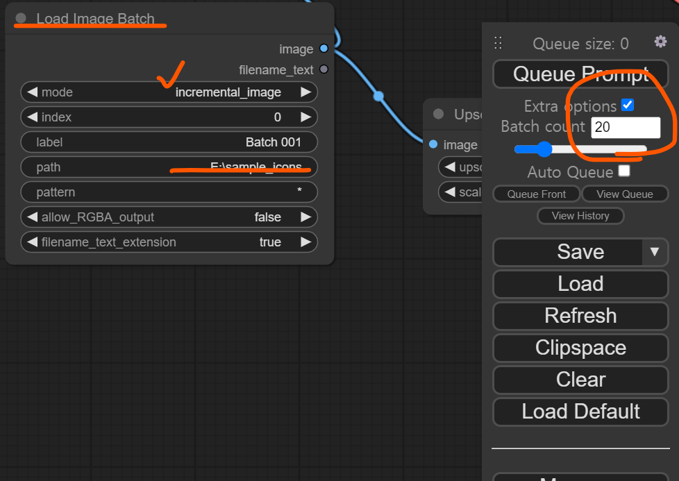 한 폴더에 작업이 필요한 이미지를 넣은 후 필요한 workflow에서 하나씩 이미지를 처리하려고 할 때 Load Image batch 노드와 Extra options의 Batch count를 이용하면 됩니다.