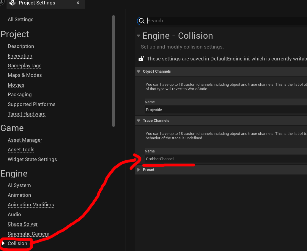 +DefaultChannelResponses=(Channel=ECC_GameTraceChannel2,DefaultResponse=ECR_Ignore,bTraceType=True,bStaticObject=False,Name="GrabberChannel")