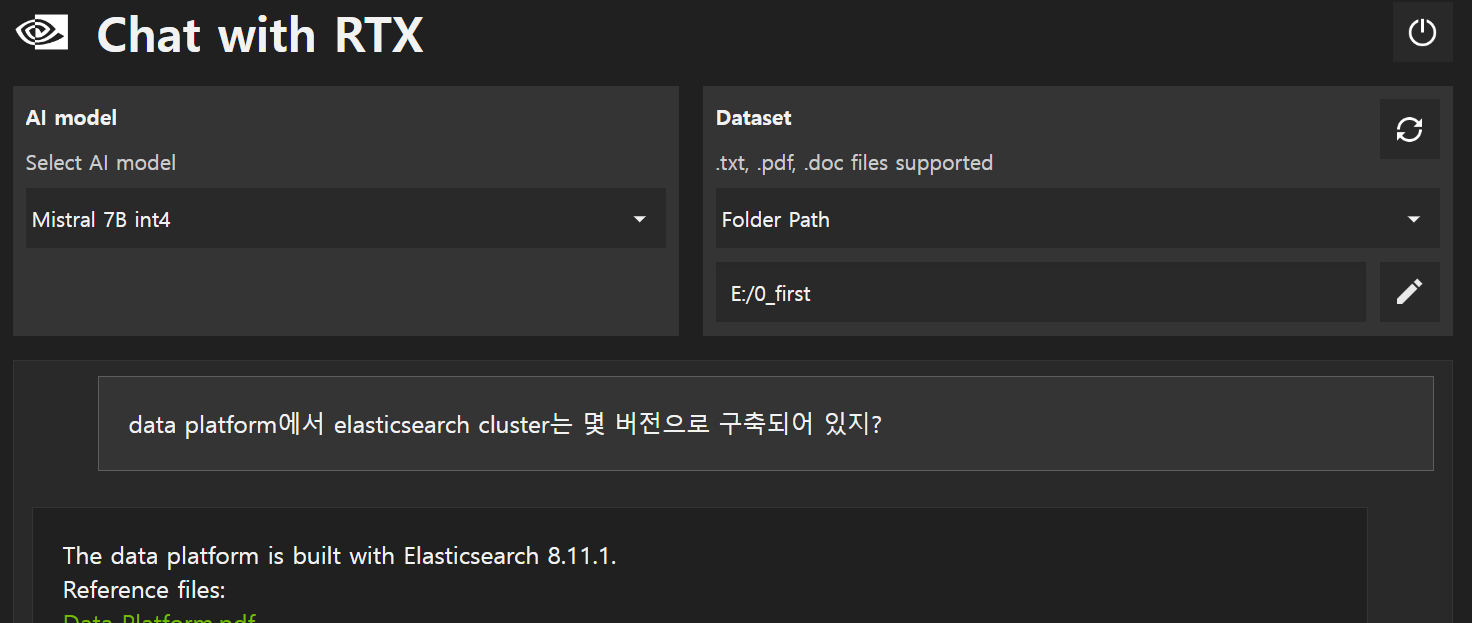 직접 만든건 답변을 완성 후 출력하고 Chat with RTX는 스트리밍으로 답변을 출력하기 때문에 끝나는 시간을 기준으로 보면 Chat with RTX가 최소 40% 이상은 빠른 듯. (TEST PC : RTX 4080 / 16GB)