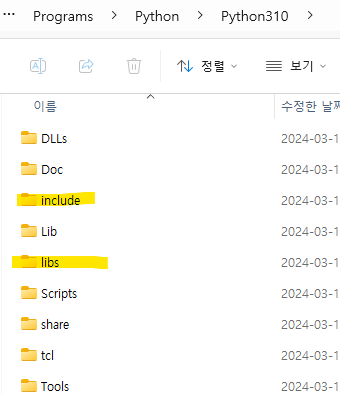 python 풀 버전은 빌드에 필요한 headers와 lib파일들을 아래와 같이 포함되어 있습니다.