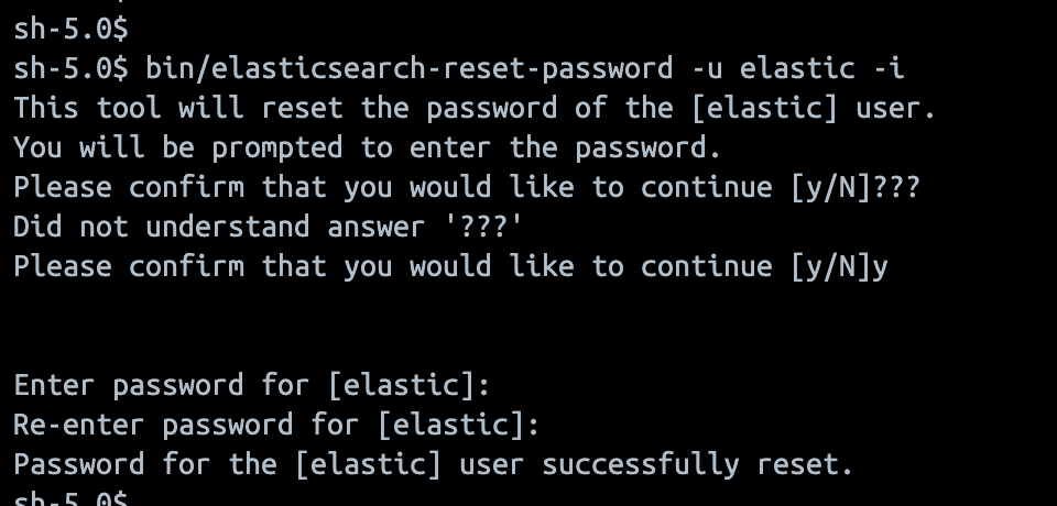 기본 Username은 elastic인데, 비번은 설정한 적이 없기에 초기화해서 사용하면 됩니다. elasticsearch docker의 exec 탭으로 다시 이동해 아래 내용을 입력합니다.
