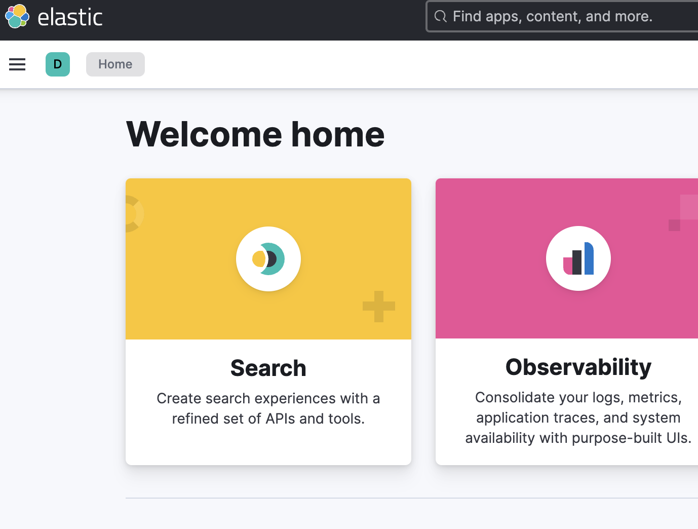 둘 모두 잘 실행되었다면 kibana로 접속합니다. http://localhost:5601로 접속하면 아래와 같은 화면이 뜹니다.