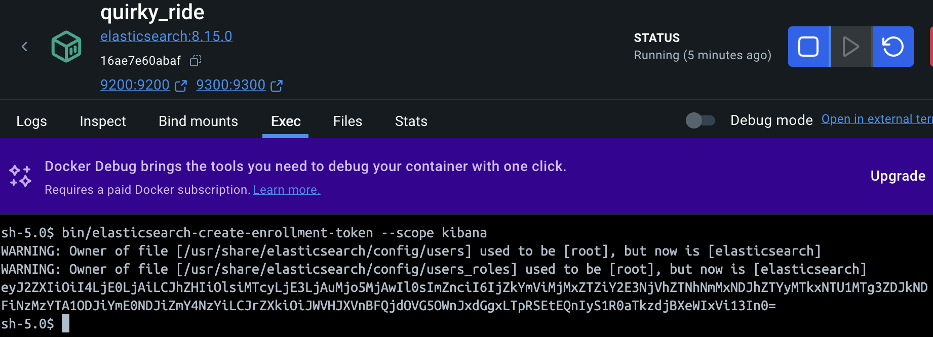 elasticsearch docker에 exec 탭에서 아래 커멘드를 입력해 토큰을 생성합니다.