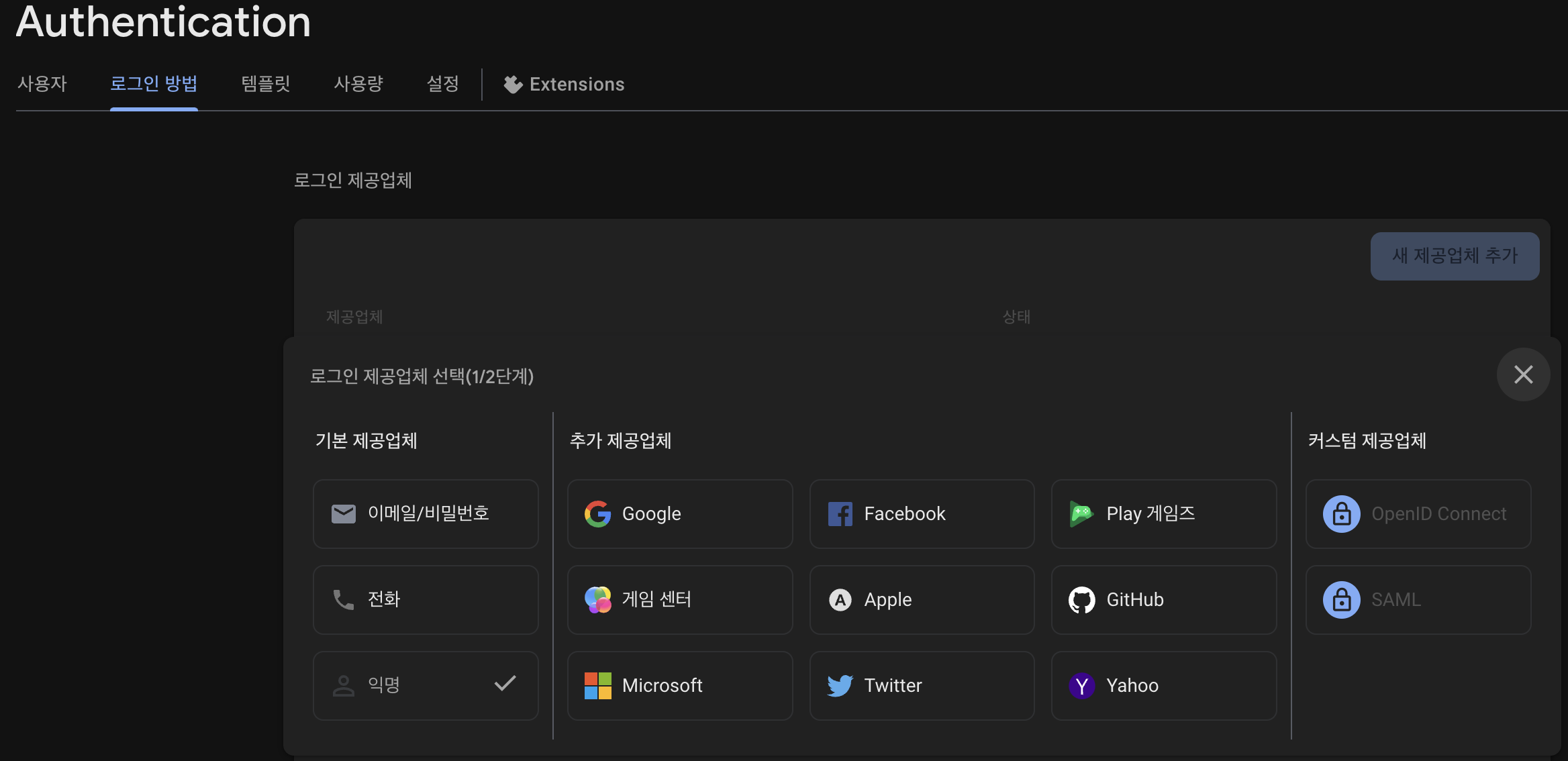 로그인 방법 -> 새 공급업체 추가를 선택 후 익명을 선택해 사용을 허가합니다.