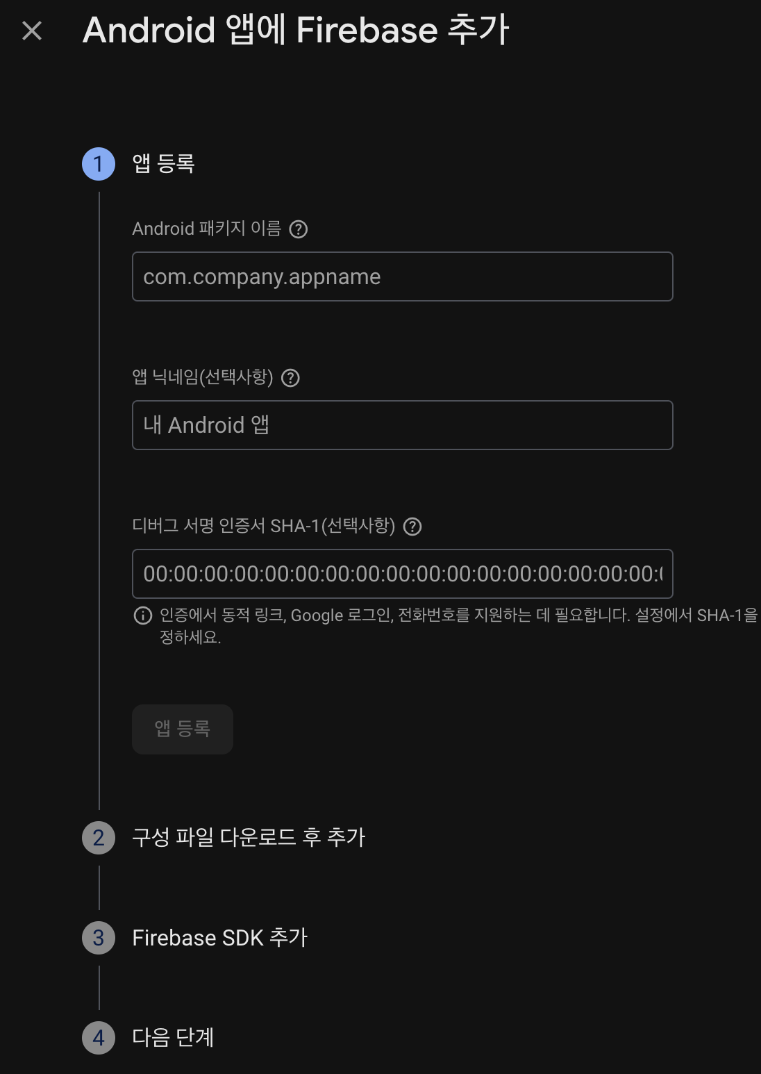 우선 유니티 에디터에서 연동하는걸 목표로 하는 것이니 패키지 이름과 앱 닉네임만 입력하고 앱을 등록합니다.