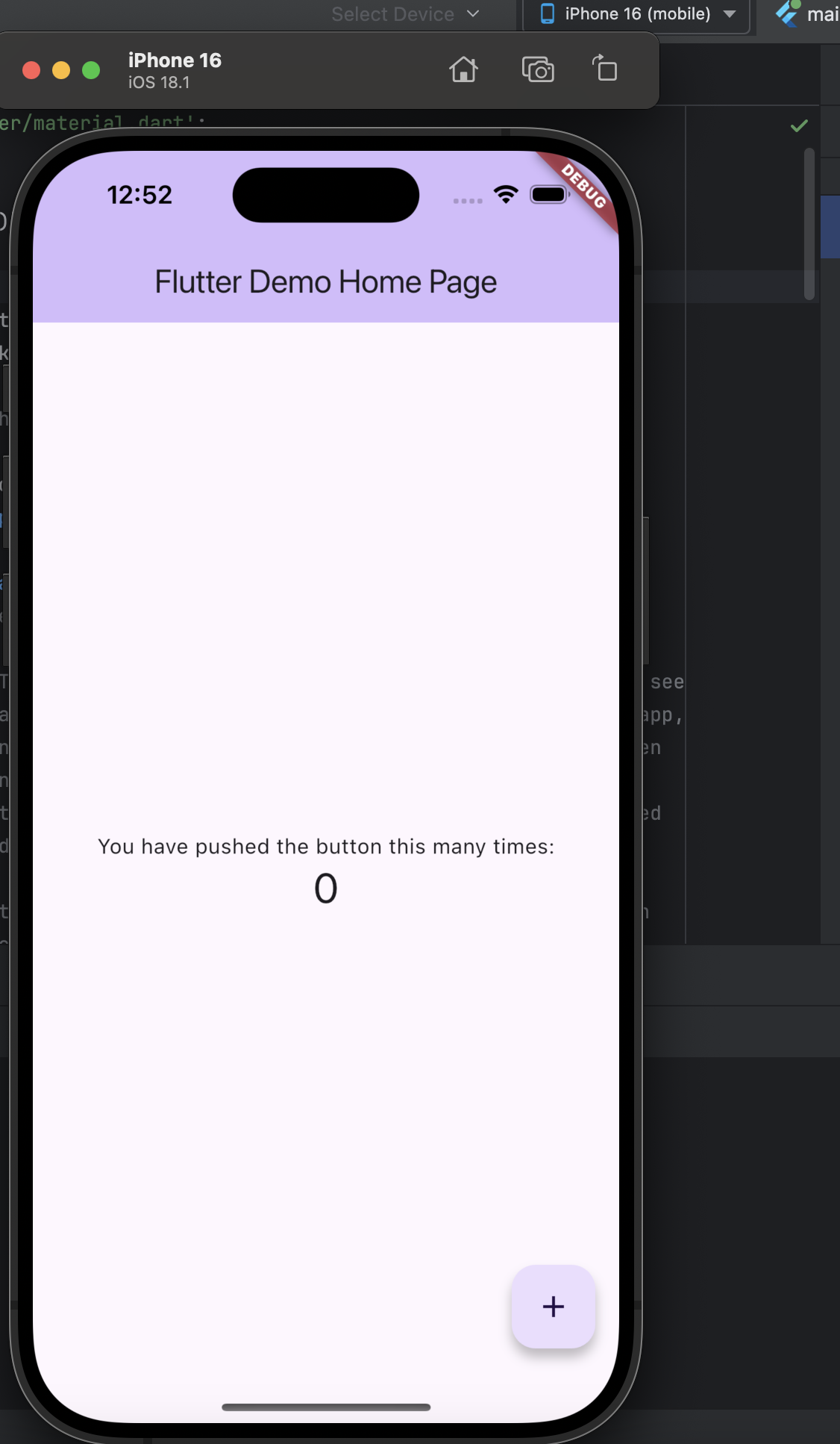 Device-> [ios 버전 선택] -> [device 선택] 을 한 후 Android Studio device 선택 메뉴에서 'Refresh'를 선택한 후 iOS Simulator를 선택합니다. 그리고 실행을 하면 아래와 같이 실행되는 것을 확인 할 수 있습니다.