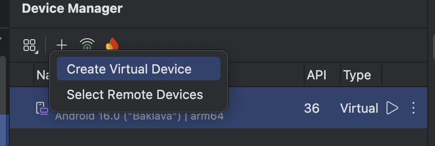 저는 pixel 8을 설치했으며 device 선택 메뉴에서 'Refresh'를 선택하면 자신이 추가한 디바이스 목록이 보이는 것을 확인할 수 있습니다.