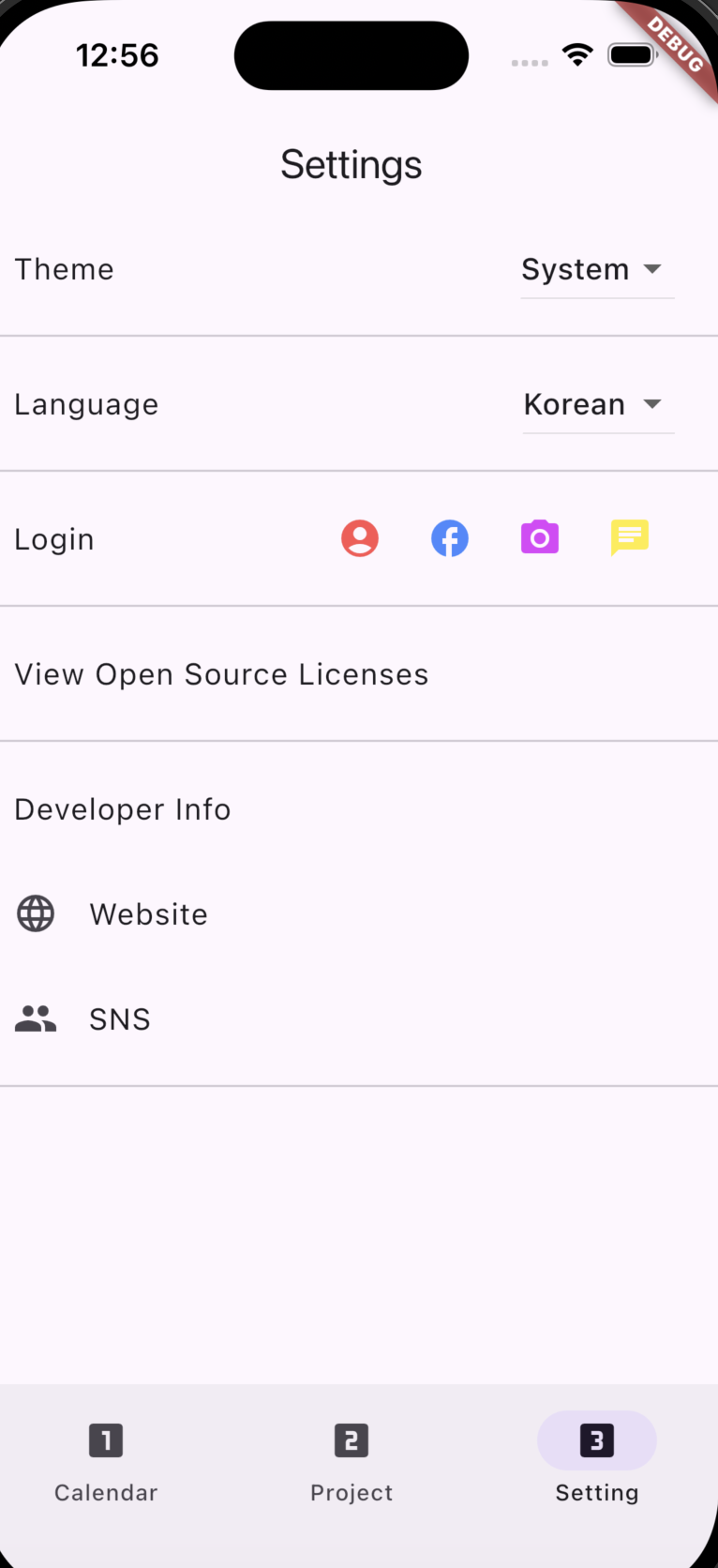 Settings 페이지에서는 Theme(System/Light/Dark), Language, Login/Logout, OpenSource list, 개발사 정보/website/SNS 정보를 추가해 보겠습니다.