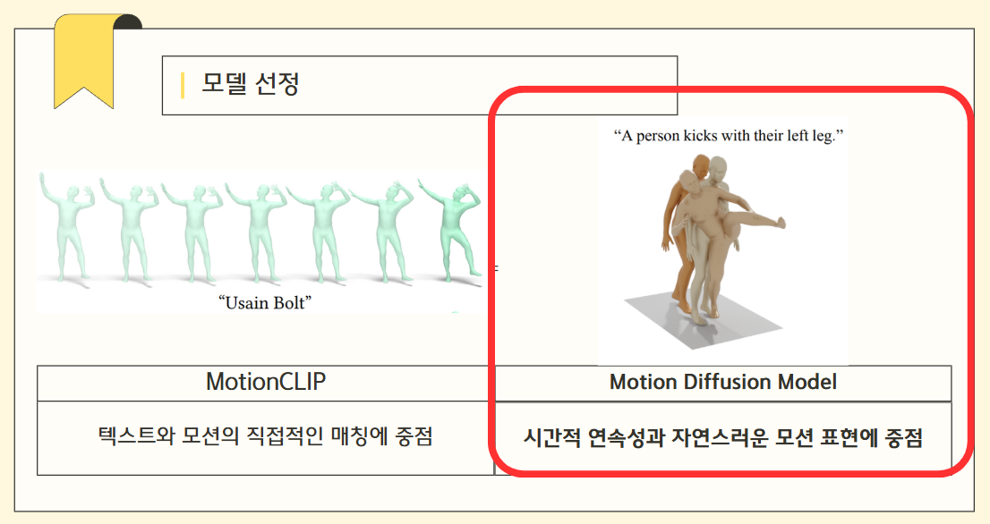 다양한 모션 생성 AI 모델을 검토했으며, MotionCLIP과 MDM(Motion Diffusion Model) 중