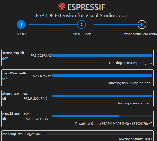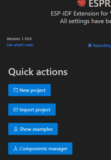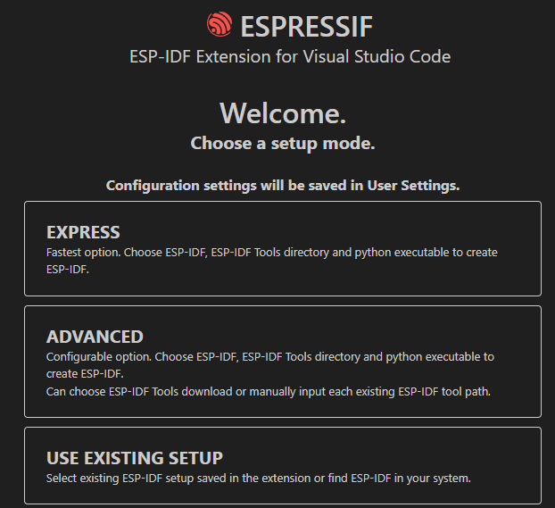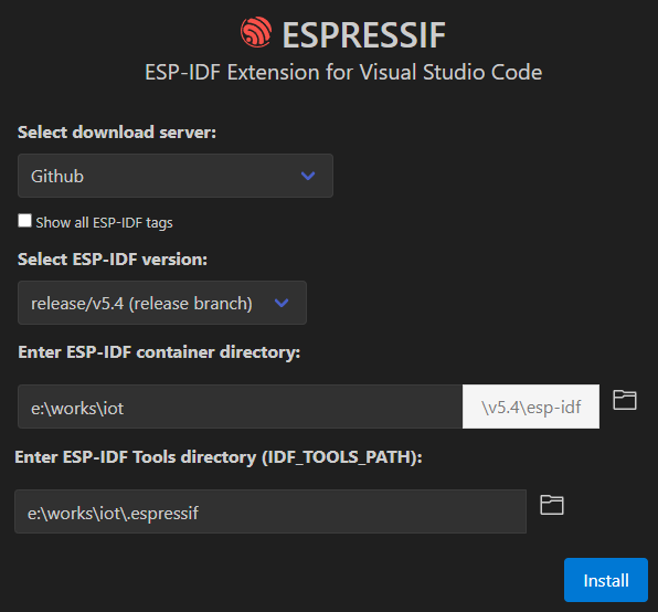 vscode -> ctrl+shift+p (mac : command+shift+p) -> esp idf:configure esp-idf extension -> express 클릭 -> (설정) -> install click