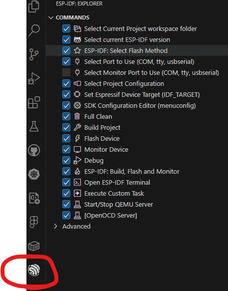왼쪽 메뉴 중 esp-idf: explorer를 선택하고 각종 명령을 vscode 내에서 실행할 수 있습니다. 환경변수 설정해서 cli로 실행할 명령들을 모두 이곳에서 처리 가능합니다.