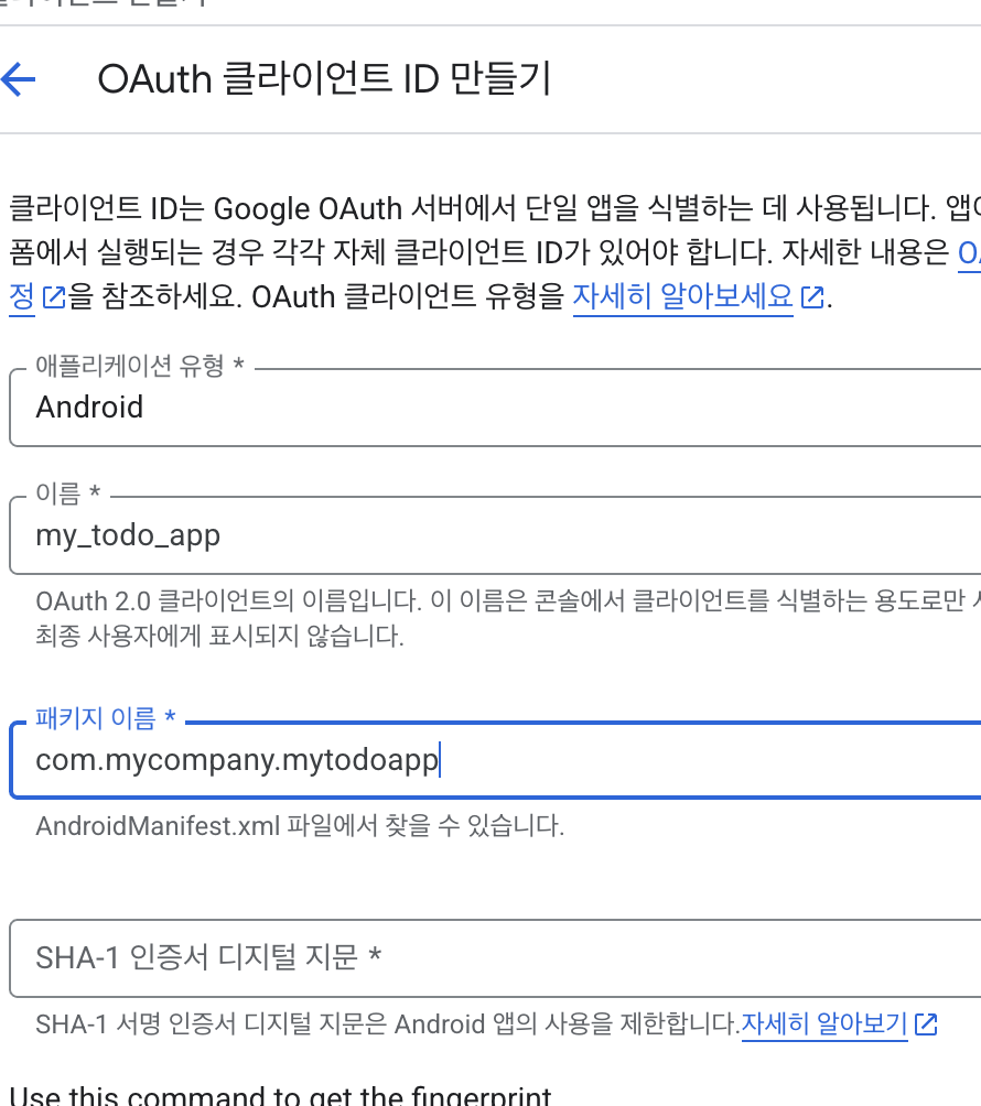 https://console.cloud.google.com/ 에서 "새 프로젝트"를 생성합니다. 그리고 "OAuth Client 만들기" 를 선택하고 Android 를 선택 후 "이름", "패키지 이름", "SHA-1 인증서 디지털 지문"을 등록합니다.