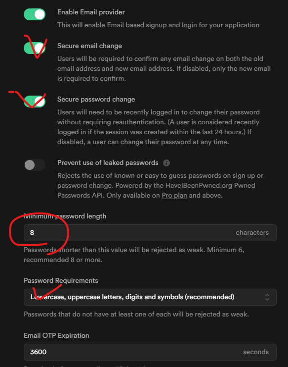 기본 이메일 로그인을 지원한다면 다음 옵션을 필수로 설정하는 것이 좋다.