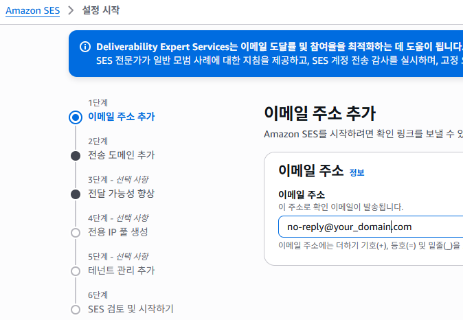 도메인을 가지고 있다면 no-reply@에 도메인을 기록해 인증을 하면 된다. 나머지는 기본값으로 설정한다. 등록된 이메일로 설정도 가능하지만 난 내 도메인에 대한 메일은 없는 상태라 도메인 인증으로 처리한다.