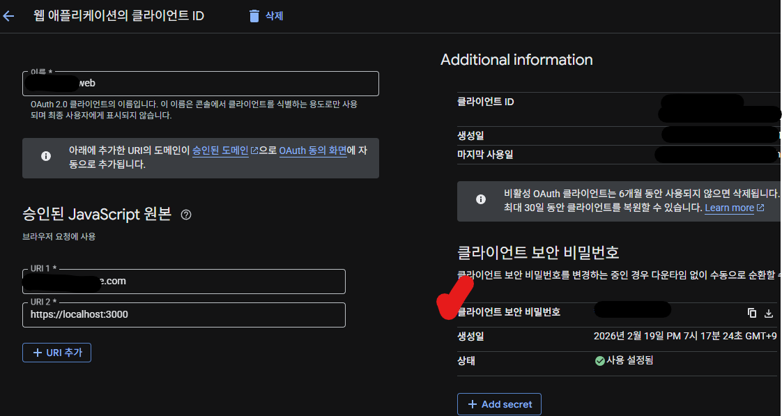 생성후 oauth client id 는 복사해둔다. 그리고 생성된 클라이언트 정보에 보면 보안 비밀번호도 확인할 수 있다.